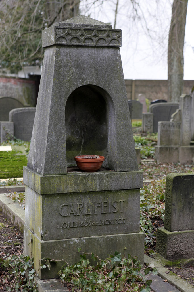 Vorheriges BildNächstes Bild Carl Feist Carl Feist (1865-1917), Teilhaber der Luna-Werke, starb in Baden-Baden und wurde dort eingeäschert. Es ist das erste Urnengrab auf dem jüdischen Friedhof. Die Urne, die auf einem Foto von 1969 noch zu sehen war, ist nicht mehr vorhanden.